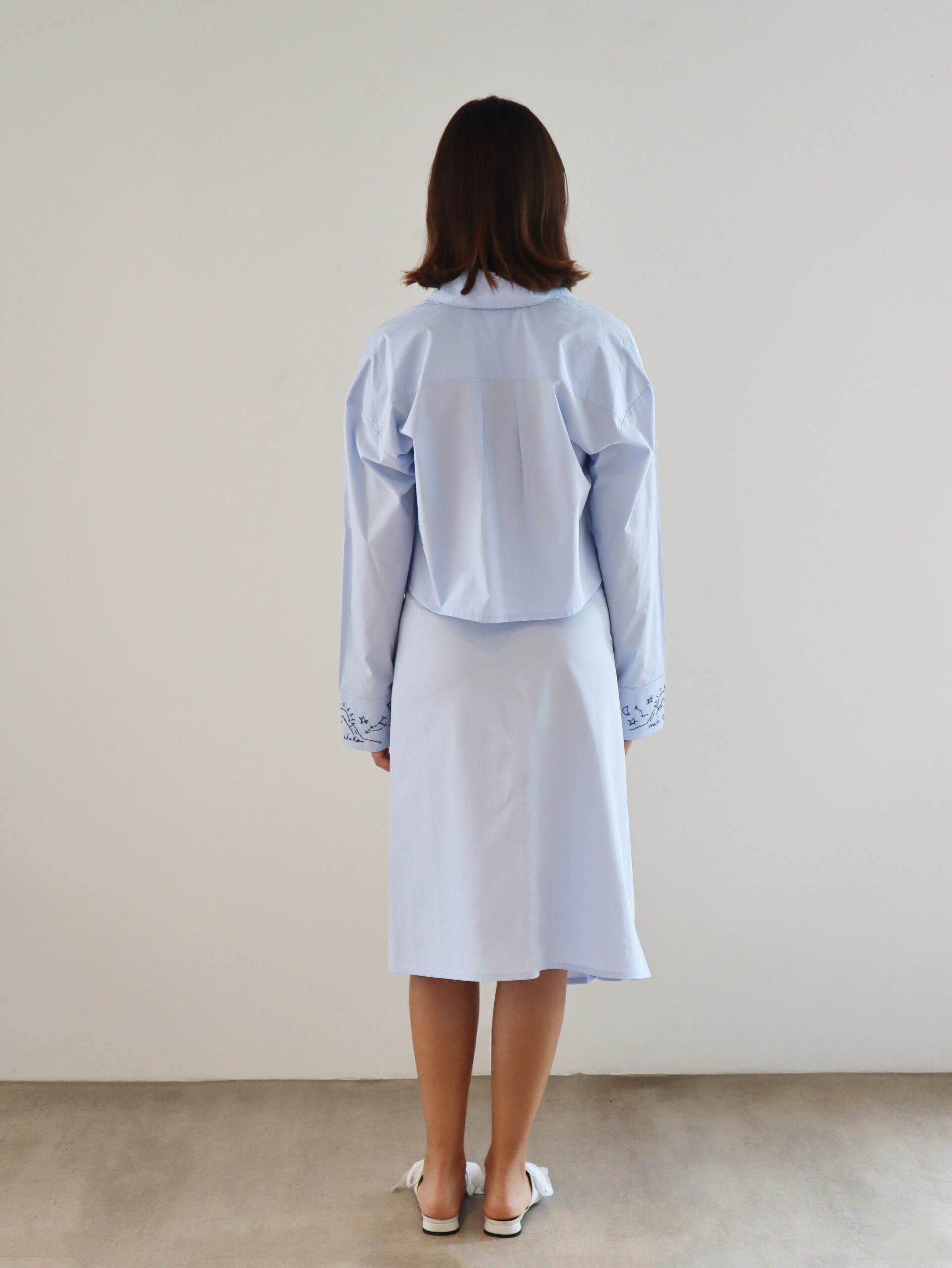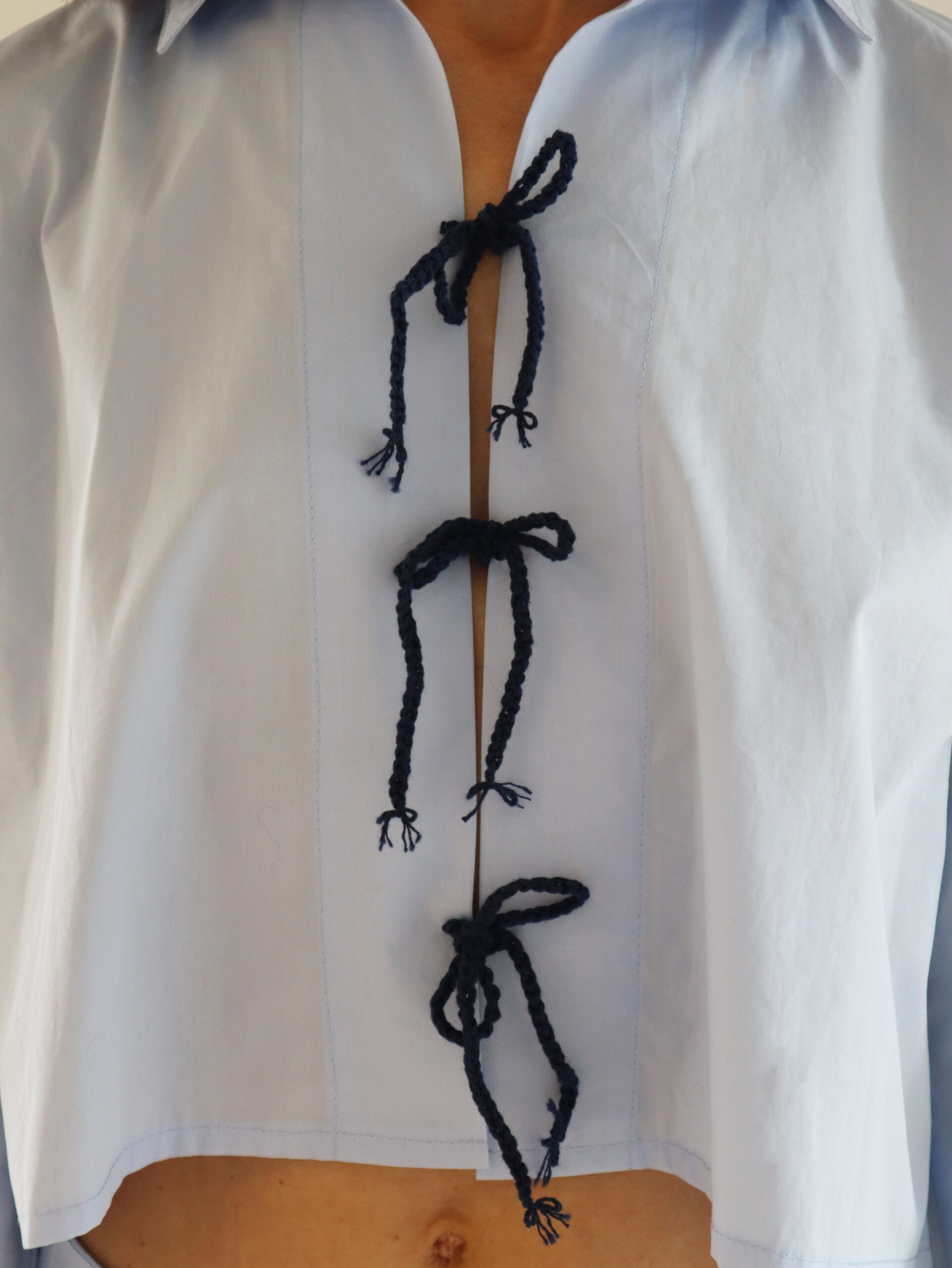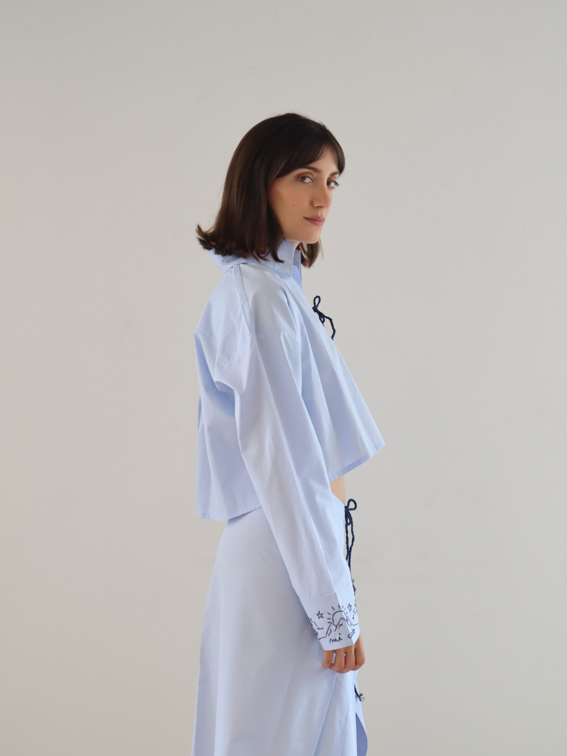 Esta camisa está confeccionada en 100% algodón, cuenta con bordados hechos a mano en las mangas. El diseño incluye cierre con lazos en la parte frontal y un corte recto y corto que aporta un estilo minimalista y funcional.