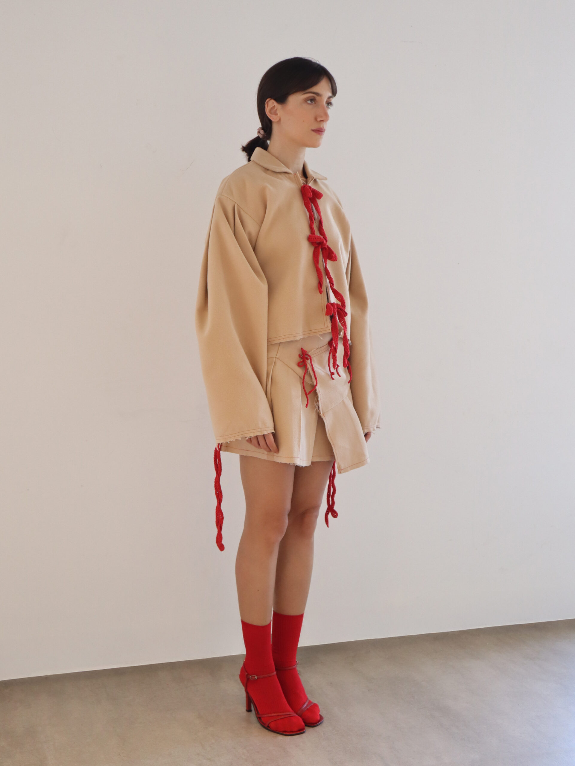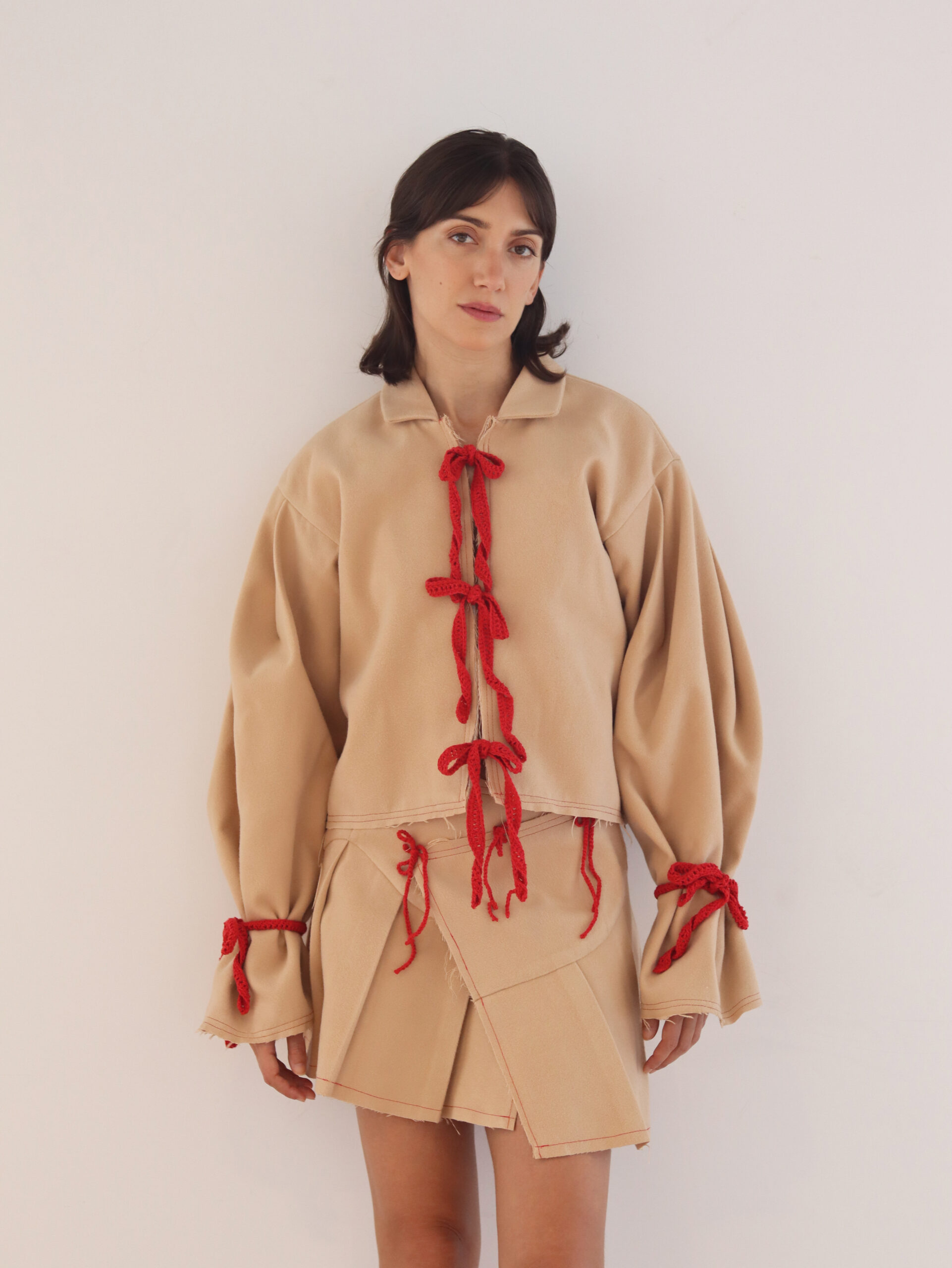 Este saco está hecho a partir upcycling y descartes textiles con acabados deshilachados y costuras visibles.