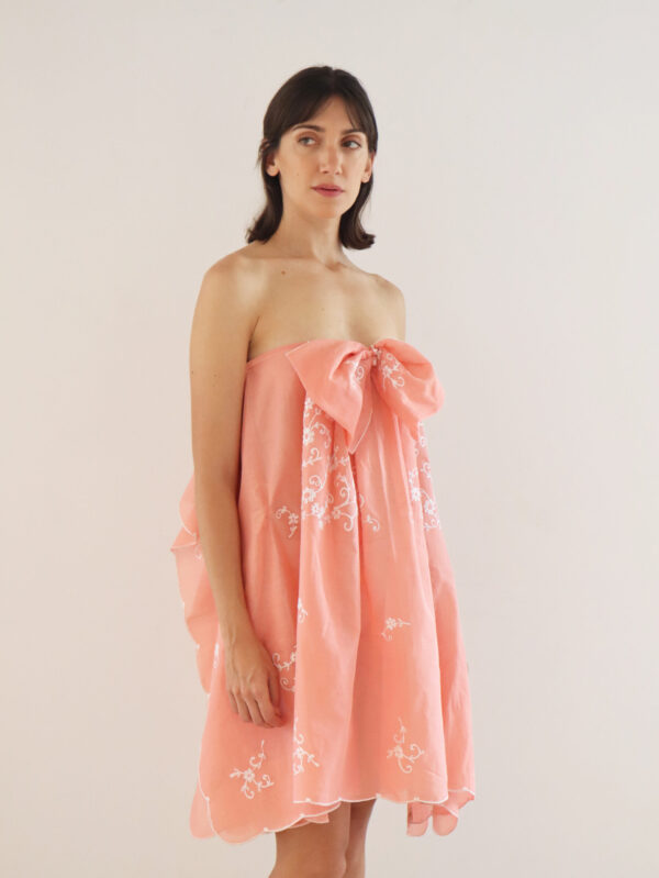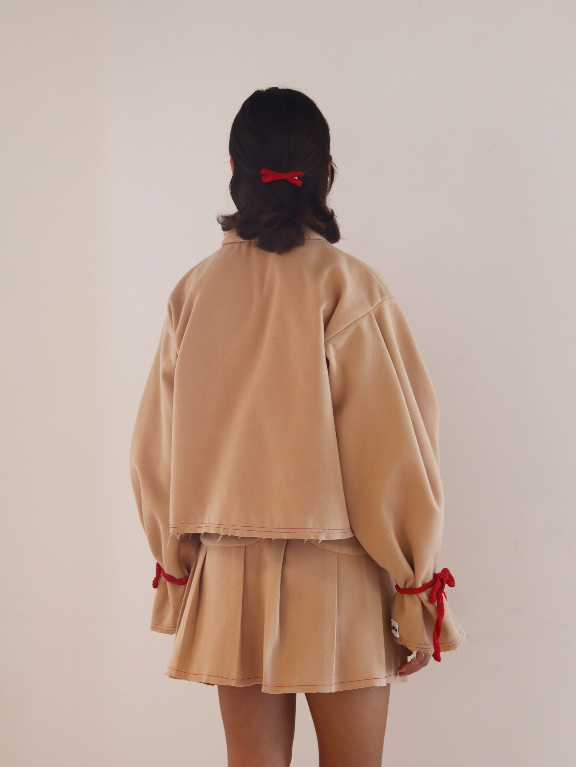 Su diseño destaca por las mangas amplias y los lazos rojos tejidos a mano, que aportan contraste y personalidad.