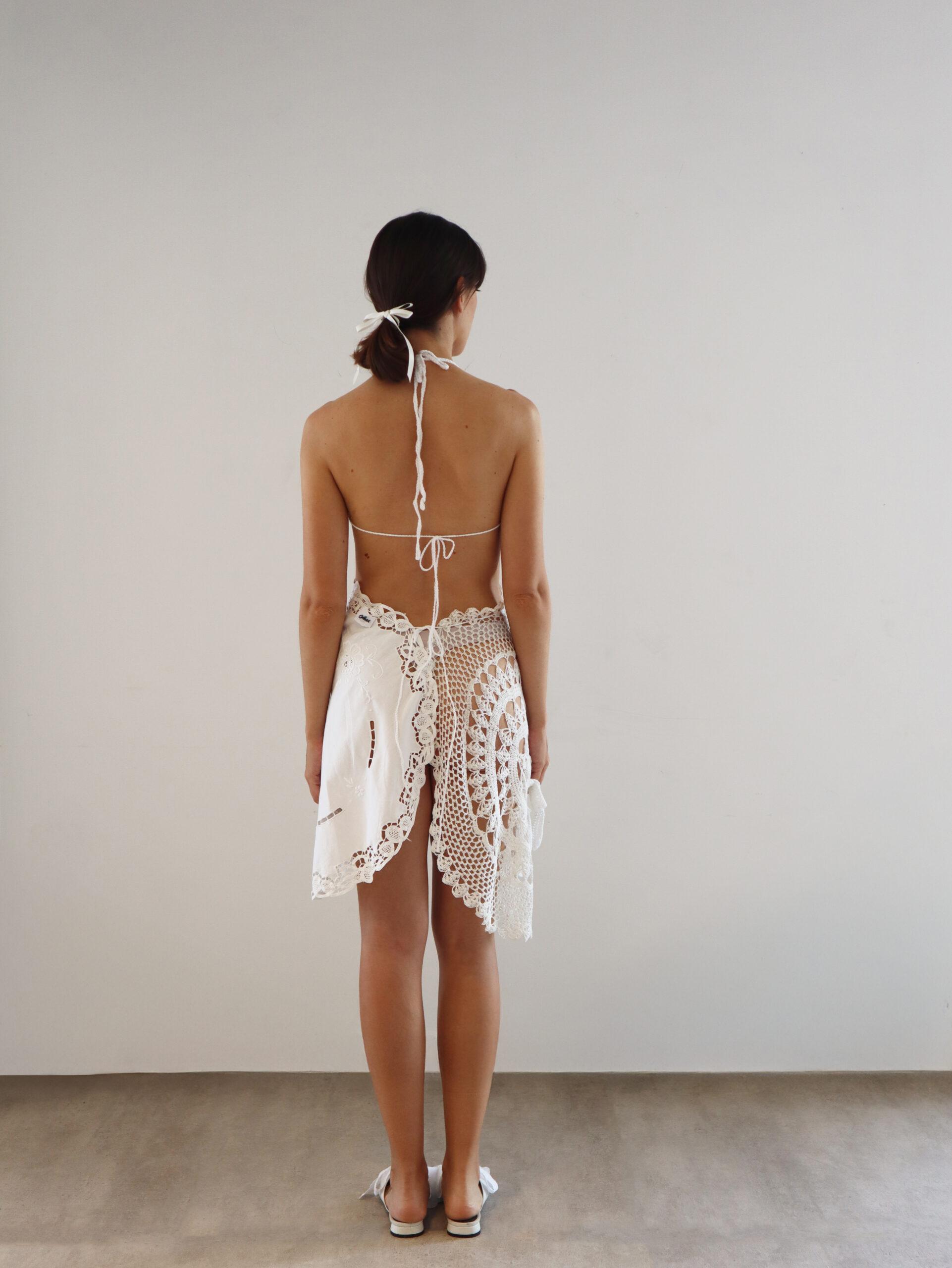 Este vestido está hecho a mano a partir de mantelería antigua reciclada, cuidadosamente transformadas en una pieza única. El diseño se ajusta en la espalda. Los tejidos reutilizados pueden presentar ligeras variaciones, como cambios de color, pequeñas manchas, agujeros o alteraciones.