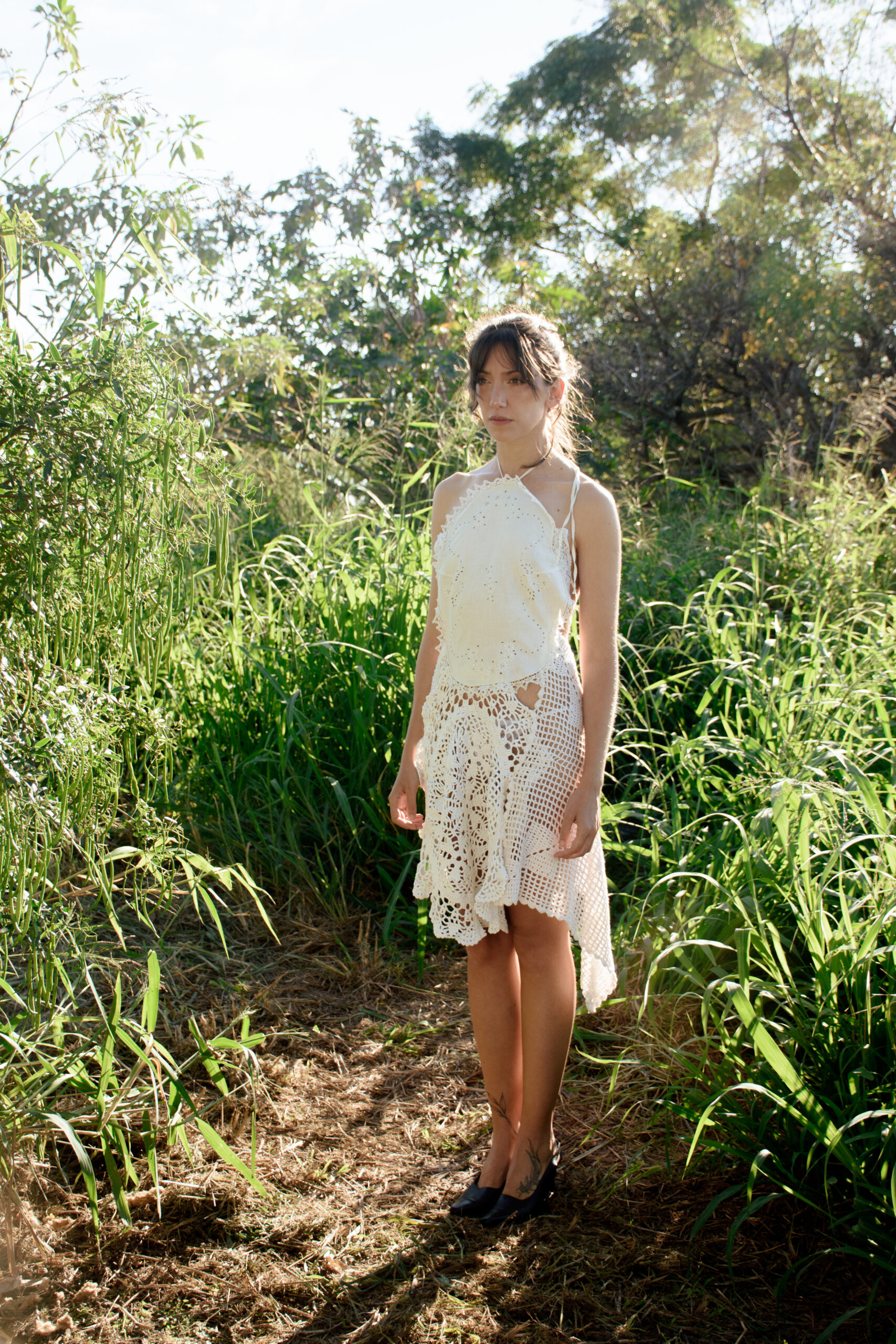 This dress is handmade from recycled vintage table linens, carefully transformed into a one-of-a-kind piece.